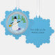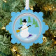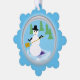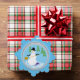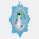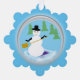 Snowman with shovel is ready to clean the snow out of his snow globe. Green pine trees are behind him. Text on back "Best wishes for the Holiday Season"