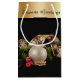 A Christmas gift bag with a touch of elegance. This Christmas gift bag is black with a gold band, at the top. The design, on the black portion is made up of a white ornament with a sprig of evergreen and a white and gold winding ribbon. For accent there's a pinecone, red berries and gold beads. The text on the gold band reads "Seasons Greetings" and can be customized. This design is available in large, medium and small gift bags.
