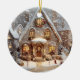 This whimsical ornament showcases a festive gingerbread house decorated with candy canes, snow-covered rooftops, and glowing lights, creating a delightful winter wonderland. A vintage trolley and snow-covered tree add to the holiday magic. Customise this ornament for a sweet addition to your tree or as a thoughtful holiday gift. A gold thread makes it easy to hang this keepsake for years of holiday joy.
