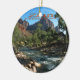 A round ceramic ornament showing an image of the Virgin River flowing through Zion National Park. Large rocks, dominate the foreground, sandy brown and rounded from millennium of flowing water. Grasses and green canopied oak trees flank the banks of this fast moving stream. The Watchman, one of the famous mountains in the park, sits in the background, thrusting up into a blue sky that's punctuated with a cluster of spotty white clouds.