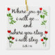 Personalised ornament with Scripture Verse on Marriage (Ruth 1:16) "Where you go, I will go...and where you stay, i will stay." Black text, with Red Heart Flowers. Cusomize the ornament with the couples' names and anniversary date on the back of the ornament.