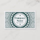 A business card template with an original ornamented design. A circular panel on the front for company name and business type decorated with circular text symbols surrounded by a decorative design. The reverse of the card retains the outer part of the design but with a larger area in the middle for name, title, and other contact details. Suitable for a variety of different businesses, could also be adapted for use as a gift card voucher or token. Having a style somewhat reminiscent of banknotes or toy money.