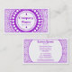A business card template with an original ornamented design. A circular panel on the front for company name and business type decorated with circular text symbols surrounded by a decorative design. The reverse of the card retains the outer part of the design but with a larger area in the middle for name, title, and other contact details. Suitable for a variety of different businesses, could also be adapted for use as a gift card voucher or token. Having a style somewhat reminiscent of banknotes or toy money.