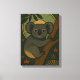 This vibrant wildlife art print features a stylised koala perched calmly at the heart of a radiant, mandala-like composition. Framed by a circular sunburst and surrounded by lush leaves, flowers, and geometric patterns in warm greens, oranges, and yellows, the koala’s expressive gaze and textured fur bring a sense of quiet strength and natural harmony.