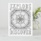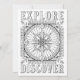 Explore and Discover - A large and elaborate nautical compass rose fills the centre of this design with a border of anchors. The text "Explore" is above the compass rose and "Discover" is below it. Colour this card and add your message to the back. Click customise for more paper and size options. From OrnaMENTALs™ Feel Good Words Colouring Book. OrnaMENTALs Colouring Fun for All Ages, Design #0119. Original artwork by Sue Chastain, suziqcreations.com.