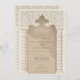 This stunning wedding invitation draws inspiration from the rich tradition of Islamic architecture, showcasing a palatial arch design, elegantly flanked by chevron-patterned columns in a nuanced palette of cream, taupe, and ecru. The intricate lace-like detailing atop the arch, rendered in shades of sand and ivory, adds a layer of sophistication, invoking the timeless beauty of intricate plasterwork found in historic mosques. This invitation is the epitome of elegance and heritage, extending a gracious invitation to your guests with its blend of cultural artistry and modern design elements, setting the stage for a wedding that celebrates love and tradition.