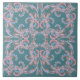 Bring refined artistry to your home décor with this elegant ceramic tile design featuring a richly detailed floral filigree pattern set against a soothing teal blue background. The composition showcases flowing botanical scrolls, stylized leaves, and delicate ornamental curves rendered in soft pink, sky blue, and warm terracotta linework. Inspired by classic decorative motifs, this symmetrical design blends vintage charm with a fresh, contemporary palette. Perfect for kitchen backsplashes, bathroom walls, fireplace accents, tabletops, or decorative installations, this tile adds depth, character, and timeless aesthetic appeal to any interior space.