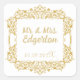 Elegant vintage ornate gold filigree square sticker with 3 lines of customisable text on white background - fill in with wedding couple's details. Use for envelope seals, favour labels and more.