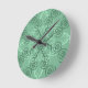 Wall clock with a detailed and intricate pattern of leaves and swirls in green and white. Ornate symmetrical design in cool soothing greens.