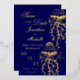 Real GOLD foil printed ornate jellyfish on blue background Save the Date Wedding Announcement.
