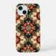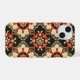 This artwork presents an intricate medallion pattern featuring symmetrical floral and geometric motifs. The design is rich with details, showcasing interlocking shapes in a harmonious colour palette of warm reds, soft creams, and muted greens against a deep black background. The repetitive and balanced arrangement of the elements creates a sense of order and elegance, reminiscent of classic tile designs and ornamental artwork. The combination of bold colours and complex patterns adds depth and visual interest to the overall composition.