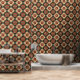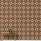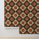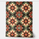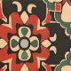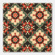 This artwork presents an intricate medallion pattern featuring symmetrical floral and geometric motifs. The design is rich with details, showcasing interlocking shapes in a harmonious colour palette of warm reds, soft creams, and muted greens against a deep black background. The repetitive and balanced arrangement of the elements creates a sense of order and elegance, reminiscent of classic tile designs and ornamental artwork. The combination of bold colours and complex patterns adds depth and visual interest to the overall composition.