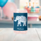 Decorative henna tattoo style elephant on dark blue background.