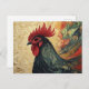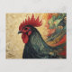 A striking portrait of a black rooster with a vivid red comb, set against an ornate background of swirling red, yellow, and green patterns for a bold, artistic flair.