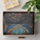 A haunting image of a beautiful butterfly with ornate scrollwork all around.