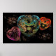 3 fractal floating hearts with ornate looking steampunk / renaissance style shapes and patterns. Colours of the hearts are a blue and green mingling together, orange and yellow and purple and pink. The image has a soft velvety fabric / textile look to it.