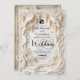 Transport your guests to a timeless era with this sophisticated design featuring a romantic garden scene in a stunning monochromatic palette.This design features a highly detailed, digitally created illustration of a formal garden landscape. The artwork simulates the look of a sculpted ivory carving or bas-relief, utilizing shadow and light to create a faux 3D appearance in shades of cream, beige, and off-white. The scene depicts a romantic bridge surrounded by lush hanging wisteria, blooming roses, and two white doves in flight. The text is presented in a stark black traditional serif paired with elegant calligraphy script for high contrast and readability against the light background.