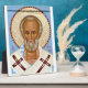 He is shown wearing the omophorion, the distinctive vestment of a bishop, often adorned with black crosses. His right hand is raised in the gesture of blessing, while his left hand holds the Gospel Book, symbolizing his role as a defender of the true faith and a teacher of the Church.