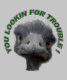 Funny face picture of a ostrich head with 'ARE YOU LOOKING FOR TROUBLE " circled around head