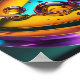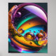 A vibrant swirl of colours creates a mesmerising, abstract spherical design with multiple reflective bubbles. The use of purple, green, and yellow hues gives it a glossy, otherworldly feel.