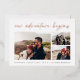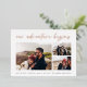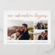 A modern and exciting save the date card for the adventure-minded couple, this clean and simple design features three horizontal or landscape orientated photos in a grid collage layout, with "our adventure begins" above in rose gold foil hand lettered script. Personalise with your announcement, names, and additional details along the bottom, and add more (like your wedding website) to the back.