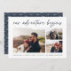 A modern and exciting save the date card for the adventure-minded couple, this clean and simple design features three horizontal or landscape orientated photos in a grid collage layout, with "our adventure begins" above in navy blue hand lettered script. Personalise with your announcement, names, and additional details along the bottom, and add more (like your wedding website) to the back.