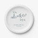 Our adventure begins teal typography wedding paper plate