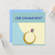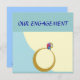 Beautifully designed ring on aqua blue background simple and elegant.'Our engagement>'on back Jion us in celebrating our engagement..on the......venue ...time..dres...rsvp