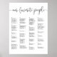 Wedding guest seating chart in classic black and white features "Our Favourite People" at the top in whimsical handwritten calligraphy script lettering, with your guest table assignments beneath, arranged alphabetically across four columns.