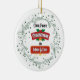 Mark your new parenthood milestone with this joyful round ornament featuring holly, snowflakes, and "Our First Christmas as Mom & Dad" in festive red and gold.