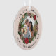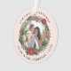 Elegant and modern personalized First Christmas ornament with beautiful Christmas wreath. Personalize the product with the year, the family name and two of your favorite wedding photos.