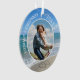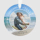 Celebrate your first Christmas together as a married couple, boyfriend and girlfriend or as an engaged couple with this elegant keepsake photo ornament. Interlocking beach wedding hearts drawn in the sand with your monogrammed initials with an elegant tropical honeymoon, anniversary vacation, ocean coastal nautical theme, and pretty turquoise water waves crashing on the shore and pastel blue sky.