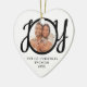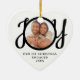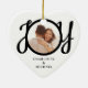 This keepsake heart-shaped First Christmas Engaged photo ceramic ornament is decorated with the word JOY in stylish black script typography. Easily customizable with your photo and message on both sides.