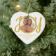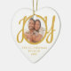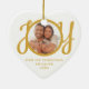 This keepsake heart-shaped First Christmas Engaged photo ceramic ornament is decorated with the word JOY in stylish gold script typography. Easily customisable.