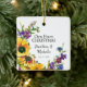 Our First Christmas ornament floral design depicts beautiful vibrant watercolor garden sunflowers, wildflowers and greenery in shades of yellow, red, purple and blue. The back features inspirational quote, "Two lives united in friendship, Two friends united in love, One love united in Christ."~