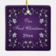 Remember your special day every Christmas with this beautiful purple ceramic ornament with simulated silver flowers and vines on the front and a pair of simulated glitter and printed on diamonds joined hearts brooch. Customisable text on front and back that you can personalise how you like. ****PLEASE NOTE that this was designed for the square ornament. If you change it to be another shape, some elements may be cut off during printing.