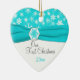 Remember your special day with this beautiful turquoise and white snowflakes, heart-shaped ceramic ornament with an aqua blue FAUX ribbon and snowflake medallion. You can customise the text to say whatever you wish. It also matches the turquoise and white snowflakes wedding collection shown below.
