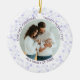 Christmas tree photo ornament, with pictures on the front and back. It is lettered with "Our First Christmas twenty twenty [year]" .. followed by your custom wording such as "as a family of three". You can also personalise the back of the ornament with your names. The photo template will display your photos in a round shape, framed with ditsy snowflakes. If you have any problems with the placement of your picture, try cropping it to a square before uploading. Lovely photo keepsake ornament that you can customise for many different events.