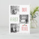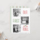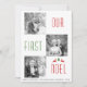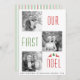 Our First Noel newlyweds First Christmas simple photo card. It features the words "Our First Noel" in red and green accented with deer and tree and three photos. A red and green striped pattern with thin stripes covers the back.