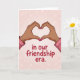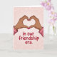 This greeting card shows two brown hands meeting in the center to form a heart shape with their fingers. The fingernails are painted a bright fuchsia pink, and the hands look gentle and steady, like a caring gesture. Each wrist has a small gold bead bracelet, and the sleeves are soft pink with visible stitching near the cuffs. The background is a light blush pink that fades a bit as it goes up, with many faint little hearts floating around behind the hands. Near the bottom, the card reads “in our friendship era” in rounded, thick crimson letters that stand out clearly. The message feels focused on friendship as well as love, making it great for a friend, partner, or someone you care about. ❤️💌🍫 Wishing you a sweet Valentine’s Day—share your feelings and let someone know they matter.