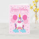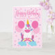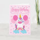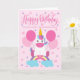 An adorable unicorn sitting on a rainbow surrounded by balloons and confetti. The top of the card has the hand lettered words 'Happy Birthday'. The perfect card for your sweet granddaughter's birthday from 'plural' you!