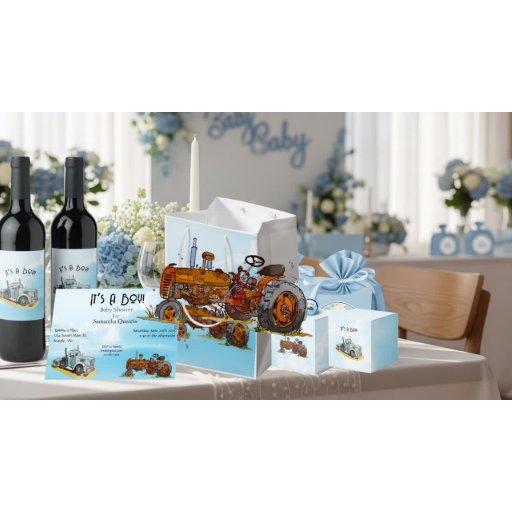 This thank you card features a beautiful and heartfelt design to show your appreciation for your loved ones. The graphic depicts both a watercolor painted antique orange tractor and a light blue semi-tractor truck, along with the text "It's A Boy." This card is a wonderful way to express your gratitude and celebrate your little boy's upcoming arrival with every detail of your special day.