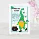 A fun greeting card 'from our home to yours' on St. Patrick's Day, with a cute dancing leprechaun, holding a shamrock, beside a pot of gold. There is a dark green, double-lined border and the original Celtic Prayer, in green lettering, beside the leprechaun. The leprechaun has a very tall hat, in a green pattern, a big ginger beard, a huge nose, striped sleeves and socks and black shoes with buckles to match his hatband. At the top, in black lettering, are the words 'FROM OUR HOME TO YOURS' and the inside message is easy to customize or delete.