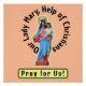 Most Holy and Immaculate Virgin, Help of Christians, we place ourselves under your motherly protection. Throughout the Church's history you have helped Christians in times of trial, temptation and danger. Time and time again, you have proven to be the Refuge of sinners, the Hope of the hopeless, the Consoler of the afflicted, and the Comforter of the dying. We promise to be faithful disciples of Jesus Christ, your Son, to proclaim His Good News of God's love for all people, and to work for peace and justice in our world. With faith in your intercession, we pray for the Church, for our family and friends, for the poor and abandoned, and all the dying. Grant, O Mary, Help of Christians, the graces of which we stand in need. (Mention your intentions.) May we serve Jesus with fidelity and love until death. Help us and our loved ones to attain the boundless joy of being forever with our Father in heaven. Amen.