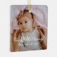 Celebrate the arrival of your precious little one with our Our Little Blessing Photo Birth Stats Keepsake Ornament. This elegant keepsake features a cherished baby photo paired with graceful typography reading “Our Little Blessing”, creating a timeless and heartfelt design. Personalise with your baby’s name and birth date to make this ornament a truly one-of-a-kind memento. The reverse side features a second photo of your little miracle with baby birth stats: birthday, time, length, and weight. Each birth stat is accompanied by an icon to represent each, along with the baby's full name. Perfect as a baby’s first Christmas ornament, a thoughtful gift for new parents, grandparents, or family members, or as a special keepsake to commemorate your newborn’s arrival. Crafted with attention to detail, this ornament preserves the joy and love of your little blessing for years to come. Design by © Moodthology Papery.