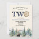 This is a Blue Our Little Lumberjack Is Turning Two Woodland Forest Bear 2nd Birthday Party Invitation.