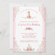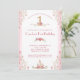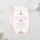 Magical fairytale invitation featuring a delicate floral in pink and green, with gold number 1 and a little princess swan at the bottom. The back of the invitation has matching floral design. Design©Rosalind Moore, Cherry Lane Designs.
