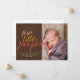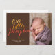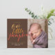 This Halloween/fall themed baby birth announcement features the words "our little pumpkin" in modern script typography in fall colours on a brown background. Your baby's birth details are displayed underneath and his or her photo sits to the right. Photography © Storytree Studios, Stanford, CA