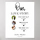 our love story wedding sign, elegant calligraphy welcome sign, wedding entrance story sign, personalised love story sign, romantic wedding welcome signage, black and white love sign, custom couple story sign, printable wedding welcome board, love timeline wedding sign, modern script wedding signage