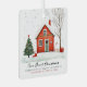 Our New Home First Home Photo Ornament - featuring a rustic illustration of a festive country home, Christmas tree and falling snow, customized with Our First Christmas (editable text) , address and family name and a photo of your new home. Makes a lovely keepsake.